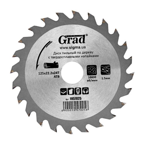 Диск пиляльний по дереву з твердосплавними напайками Ø125×22.2×24Т, 10000об/хв GRAD