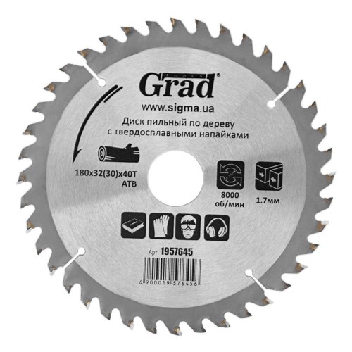 Диск пиляльний по дереву з твердосплавними напайками Ø180×32 (30)×40Т, 8000об/хв GRAD