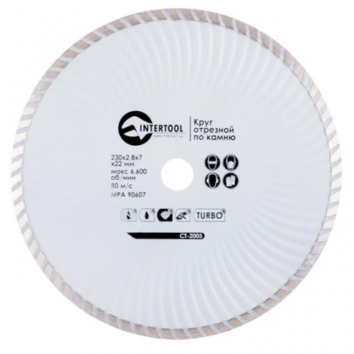 Алмазний відрізний диск TURBO INTERTOOL CT-2005 діаметром 230 мм призначений для використання з кутовими шліфмашинами з високою швидкістю обертання, а також з бензиновими ручними відрізними машинами. Перевагою алмазних дисків класу TURBO є більш висока швидкість різання при роботах з каменем, цеглою і бетоном. Наявність спеціальних каналів допомагає швидко відводити пил у процесі різання. Склад металу самого диска, а також суцільний алмазомісткий шар відрізного круга гофрований, що дозволяє витримувати серйозне силове і теплове навантаження и дає можливість здійснювати роботи з різання бетону і цегли сухим способом, не охолоджуючи алмазний турбо-диск. Також їх можна застосовувати і для мокрого типу різання. Насичення алмазною крихтою - до 18%.