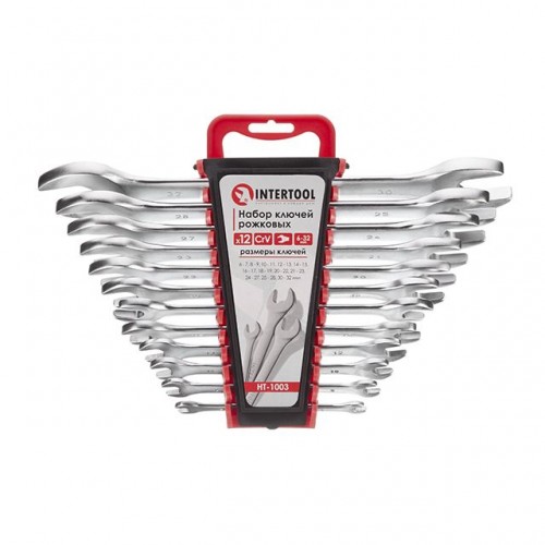 В набор INTERTOOL HT-1003 вошли рожковые ключи, размерами: 6х7; 8х9; 10х11; 12х13; 14х15; 16х17; 18х19; 20х22; 21х23; 24х27; 25х28; 30х32 мм. Это позволяет выбрать необходимый размер под любые задачи по монтажу и демонтажу резьбовых соединений гаек и болтов.